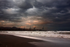 Имя файла изображения: industrial-port-sky-dusk Альтернативный текст изображения: Промышленные краны в порту на фоне облачного неба в сумерках, на переднем плане — бурные морские волны.